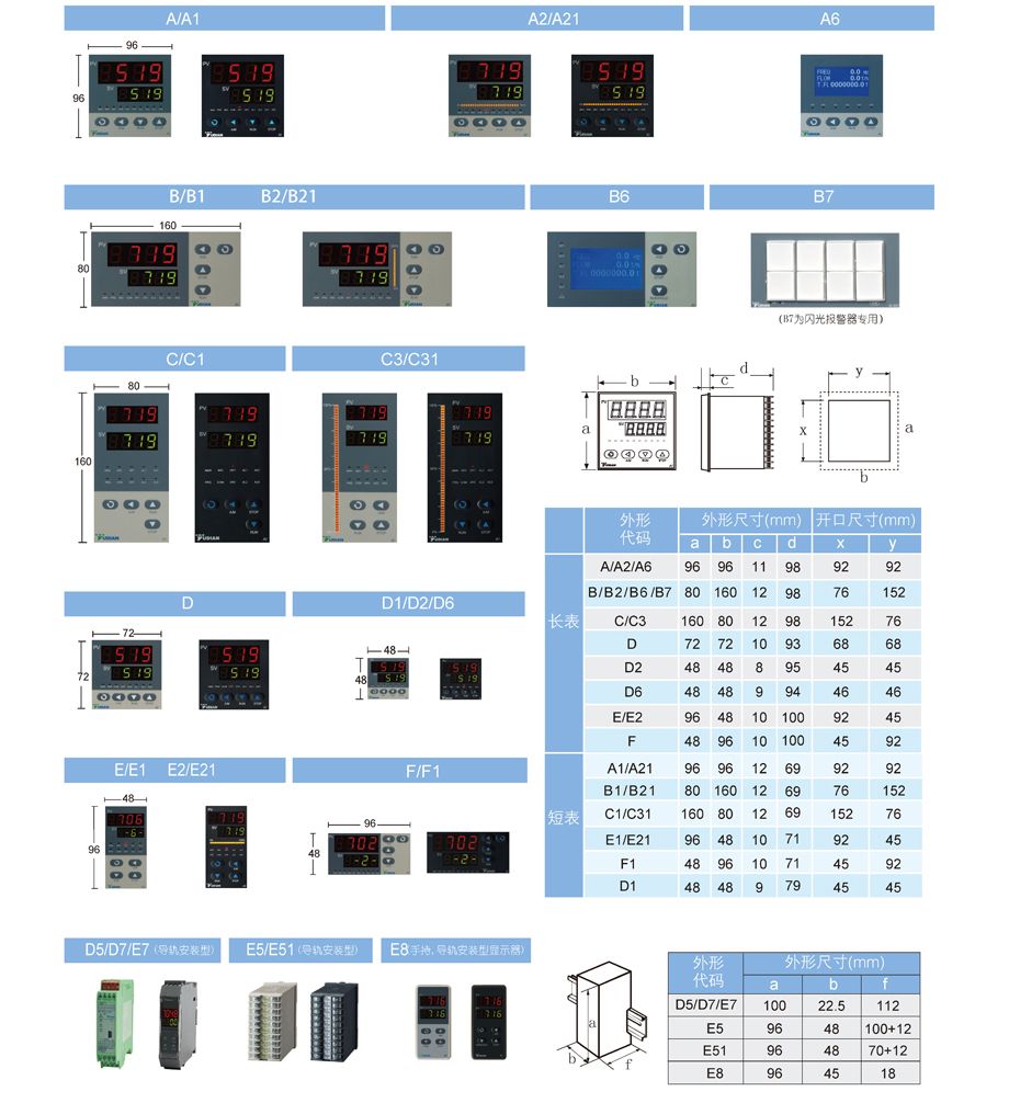 由于采用平台化技术,AI系列仪表提供多种可供选择的经典盘装数显仪表面板,也可以选择D5、D7、E5、E7型DIN导轨安装外壳;盘装仪表面板可提供靓丽黑色及经典浅色供客户选择。
