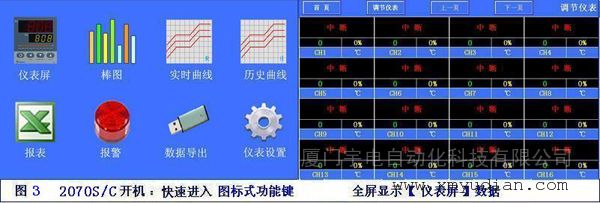 AIMINI-DCS超小型集散温湿度监控系统的操作方式:软件界面有固定的触摸按键点【开始】出现目录条显示【数据】【流量数据】【实时曲线】、【棒图】、【实时多曲线】、【历史曲线】、【流程图】【历史报表】、【报警报表】【仪表设置】【记录设置】【前页】【后页】【手动/自动】翻页、【参数设置】【程序设置】;控制程序的【启动】【暂停】【停止】等固定的操作方法。