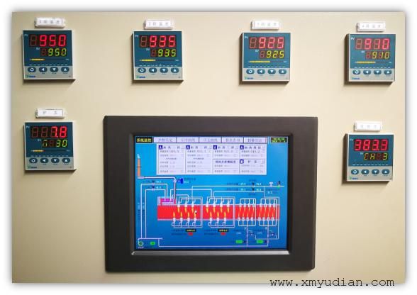 燃气明火热处理炉对燃烧要求非常严格,产品在线连续生产时需要炉膛温度和燃烧压力非常稳定(1000℃±5℃),而且现场的工作环境比较严峻(粉尘,环境温度比较高)尤其是在线生产设备如果因为温控失效会导致整条生产线停车而产生大量的额外生产成本;我公司通过严格的市场调研,在产品性能、技术服务、性价比等多方面加以对比,多厂家多供应商测试,加之已经积累了使用宇电测控仪表产品的体会,选定了宇电AI系列测控仪表产品。其中温度控制仪表选用了AI人工智能工业调节器:炉膛热电偶信号通过补偿导线接至AI-719,通过宇电仪表的PID输出模拟量或者开关量控制各个炉段的电动阀门,AI-706多路巡检仪可以同时检测多路信号,节约设备厂家的硬件成本。