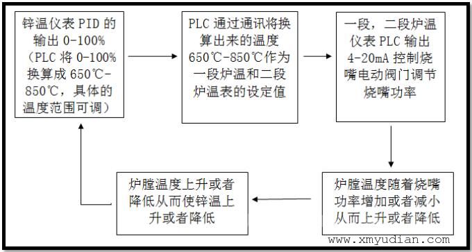 设备改进后的工作原理如图6所示,锌温仪表根据实际锌温和设定锌温PID运算,仪表的输出0%-100%,PLC通过仪表的标准Modbus通讯功能读取仪表的输出0%-100%,通过程序将0%-100%换算为650℃-850℃(这个温度范围为现场调试后总结的经验数据)计算得出的这个温度就作为一段和二段炉膛温度控制仪表的设定值,这里再次运用到仪表的标准Modbus通讯功能,通过通讯的写功能自动的将设定温度写入仪表,从而使得一段,二段炉膛温度控制仪表的设定温度会根据锌温变化随之变化,而且这种变化是很线性的,不存在跳变。炉温升高或者降低使得锌温也得到变化,锌温热电偶检测到实时锌温在进行PID计算从而调节炉温的设定值,从而实现一个闭环控制。