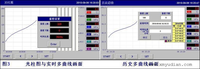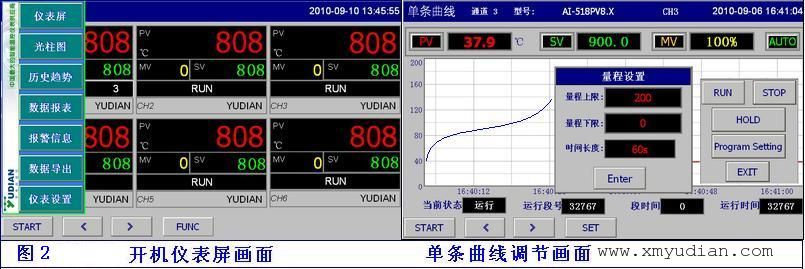 1、数据采集及控制:软件系统从工业现场温度控制器采集测量值,编辑实时曲线,可同时显示8条实时曲线,用颜色来区别。曲线显示可选百分比与实时曲线2种图。也可屏蔽其他曲线,显示单条曲线。呈现的实时数据,并存入系统内数据库,以便日后数据查询等使用。在流程图、实时趋势图或仪表画面上: