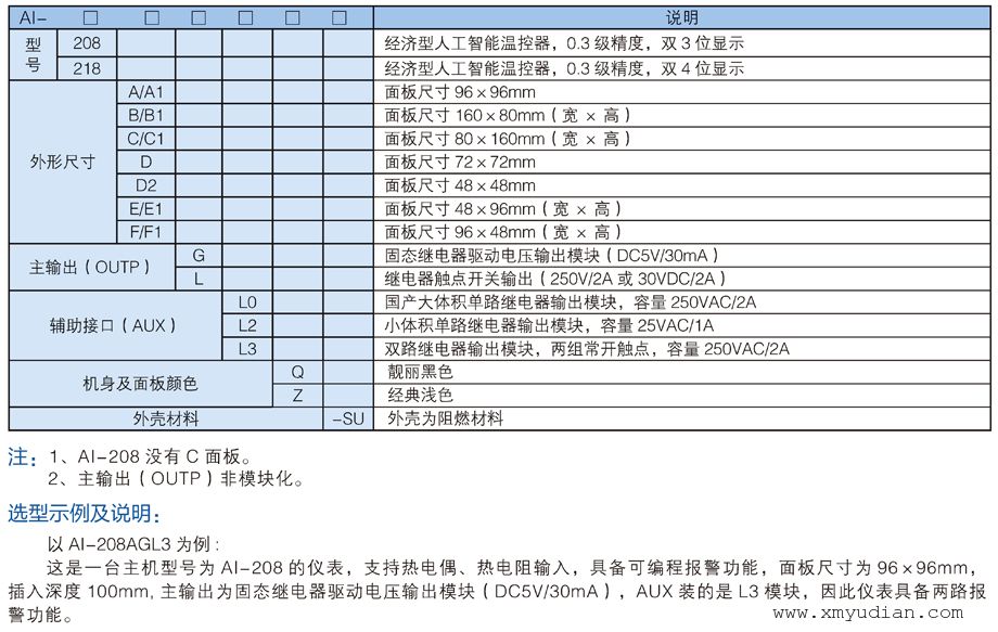 详细信息| 询价留言品牌:YUDIAN 型号:AI-208 加工定制:否 开孔尺寸:92 mm 安装型式:92*92 控制模式:温度 测温误差:0.3 输出信号:G mA 工作电压:220 V 外形尺寸:96 mm 重量:0.5 Kg 工作电压:220 V AI系列经济型智能温控器