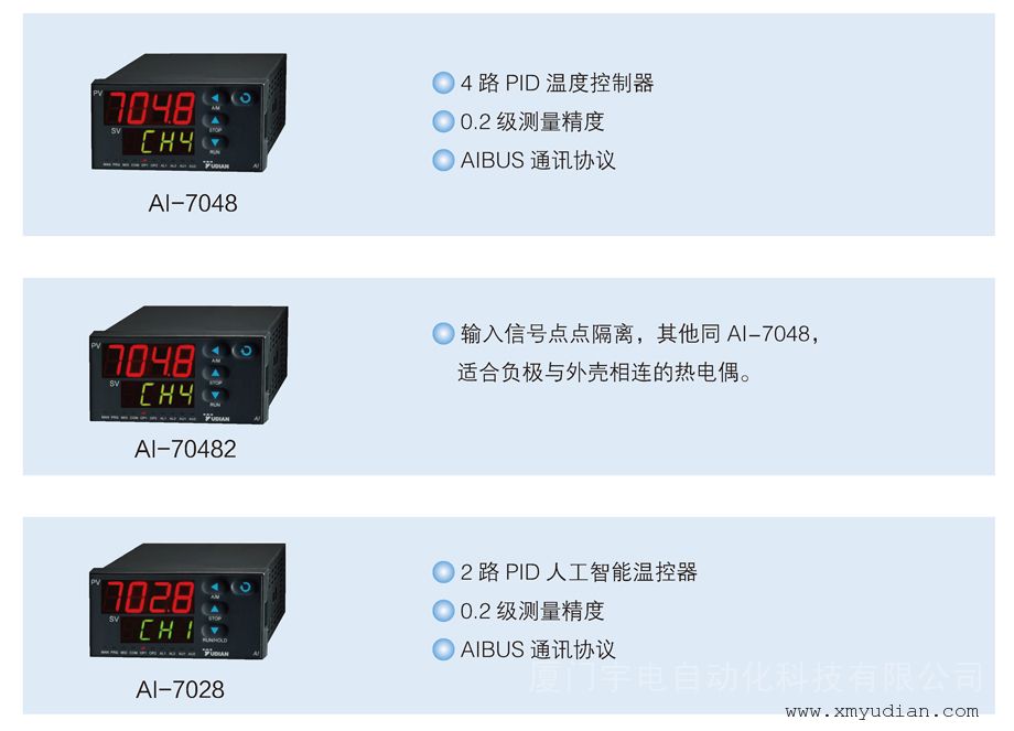 AI系列多路PID温度控制器采用热电偶或Pt100二线制输入,SSR固态继电器电压输出或L3继电器输出,各通道可以有不同的输入规格,既可以独立使用,也可以和触摸屏或PLC联机使用。产品按十年以上寿命设计,五年免费保修,应用了宇电公司新一代技术,使多路温控器达到与单回路仪表相当的精度与抗干扰能力。